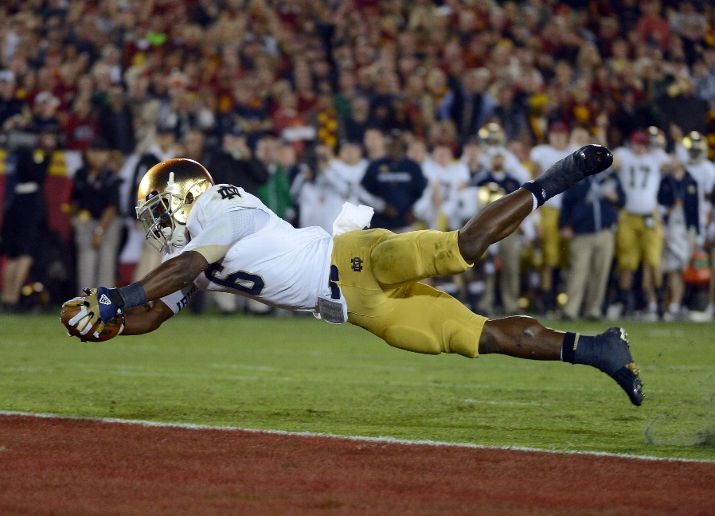 This game was played at USC, but even if it was played at Notre Dame, we would have been treated to near perfection. Why? REAL GRASS folks! This sucker was all grass stains, dirt, blood and sweat. No names on either teams' jerseys. Grey facemasks. Simple, bold, clean colors and designs. The golden dome of ND with it's new shiny paint and the classic USC trojan. Real block bold football numbers. Black cleats with white laces all over the place on the ND side. I can even forgive the black socks because of the cool stripes. AND, even one USC player had black cleats! The stadium was packed, the bands were playing loud, the students were all crazy and nuts. This game was why I watch football. I couldn't take my eyes off this game.